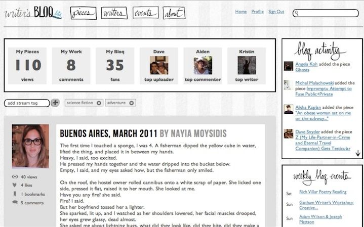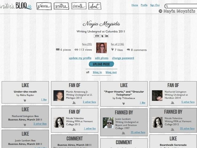 She started talking to other writers about what to do. The problem was clear. The solution was not. Nayia wanted to create a place where writers can workshop each other’s pieces like they do in undergrad and graduate MFA programs. She wanted to create a space for dialogue where Columbia students can meet students from NYU, the New School and other writing programs. She started developing Writer’s Bloq in the summer of 2011 and launched the site in February 2012. Though she had applied to several MFA programs, she decided that now was the time to help writers overcome the struggles of publishing. She gained some investors and has dedicated herself to the site full time. Several times during our conversation, she repeated that her goal is to “enhance every writer on the site.”